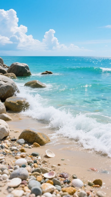 清澈透明的海水环绕着光滑的白色沙滩,阳光洒在海面上闪烁着金色的光芒,远处是蔚蓝的天空和几朵悠闲的白云,海浪轻轻拍打着岸边的礁石,溅起晶莹的水花,整体呈现出明亮、清新、宁静的夏日海洋氛围,具有高清晰度的写实质感和柔和的光影效果。