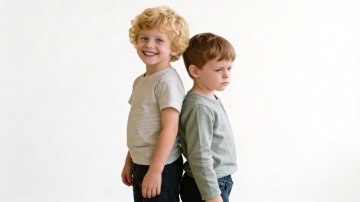 两个金发幼儿在温馨明亮的客厅木地板上玩耍,一个穿着橙白条纹短袖和蓝色牛仔裤,另一个穿着蓝白条纹短袖和蓝色牛仔裤,两人面对面跪坐,伸手触碰地面,脸上洋溢着开心的笑容,眼神充满童真。背景有米色沙发、黄色窗帘、木质书架和绿植,整体采用写实摄影风格,光线柔和自然,主色调为温暖的橙色、蓝色和米色,营造出温馨可爱、充满童趣的氛围。