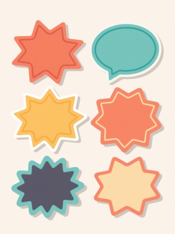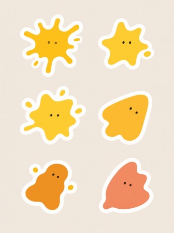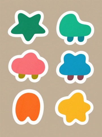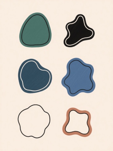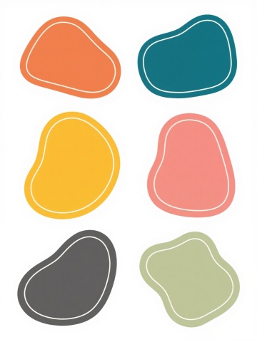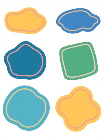 极简手绘涂鸦风格插画,浅色背景上排列6个不同配色、不同样式、不同材质的不规则图形造型,分上下两行对齐排列,每个图形边缘有白色描边,色彩明快鲜亮,线条圆润流畅,整体呈现轻松活泼的视觉效果,图形造型富有变化,材质感通过色彩浓淡和边缘处理区分,画面简洁干净,视觉焦点突出。