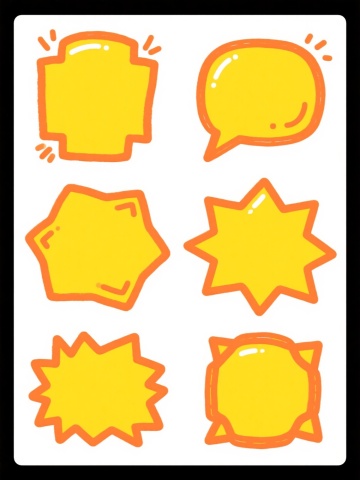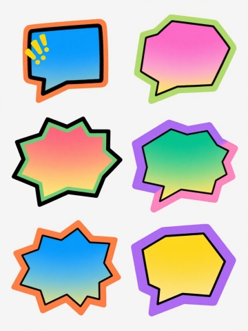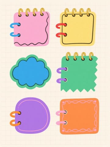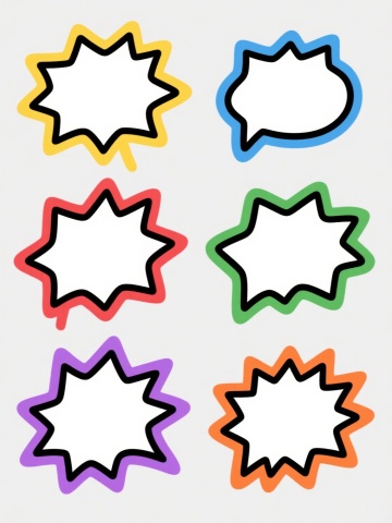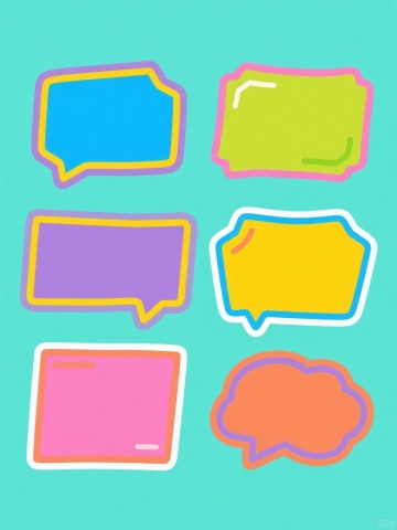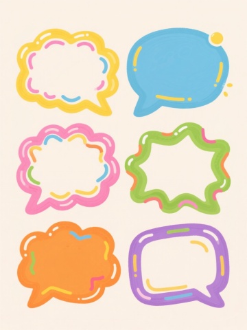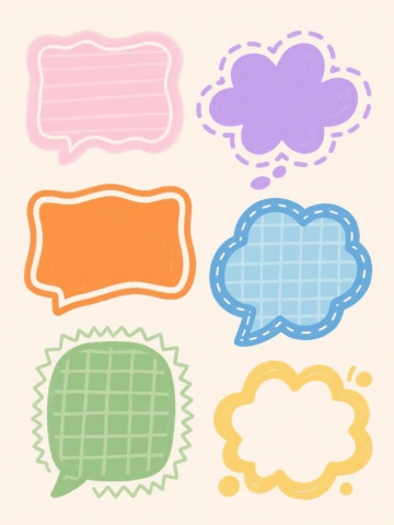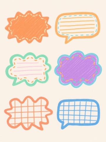 手绘风格的六个不同配色气泡框设计集合,浅米色背景,左右两行对齐排列。左侧三个气泡框从上到下分别为:顶部浅粉色气泡框,内部有细密的水平线条纹理,边框为手绘风格的波浪形轮廓,带有轻微的晕染效果;中间橙色气泡框,无内部纹理,边框为双层线条设计,外层线条较粗且带有向外扩散的笔触;底部绿色气泡框,内部为网格状纹理,边框线条流畅且边缘有细小的锯齿状装饰。右侧三个气泡框从上到下分别为:顶部紫色气泡框,无内部纹理,边框为虚线勾勒的云朵形状,线条带有轻微的抖动效果;中间蓝色气泡框,内部为细密的方格纹理,边框为双层线条设计,内层线条较细且颜色较浅;底部黄色气泡框,无内部纹理,边框为手绘风格的不规则曲线,线条末端有小圆圈装饰。所有气泡框均保持统一的手绘质感,线条边缘有自然的毛边效果,整体风格活泼可爱,适合用于儿童主题的设计项目。