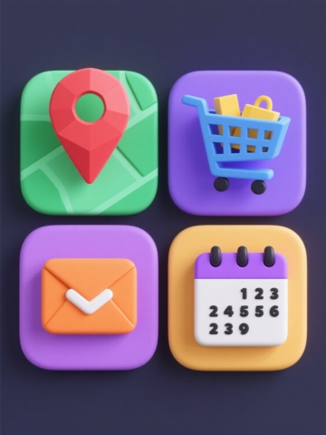 软3D风格系列素材集合,纯色背景,6个完全不同元素内容规整排布,保持元素类目。第一个元素为绿色背景上的立体购物袋图标,圆润造型,高光柔和,阴影细腻;第二个元素为蓝色背景上的立体咖啡杯图标,杯身光滑,带有弧形把手,底部有轻微投影;第三个元素为黄色背景上的立体书本图标,书页有层次感,书脊清晰,整体呈倾斜放置;第四个元素为红色背景上的立体相机图标,镜头突出,机身有圆润边角,细节丰富;第五个元素为紫色背景上的立体音乐符图标,音符线条流畅,具有立体感,悬浮于背景之上;第六个元素为橙色背景上的立体信封图标,信封开口处有折叠细节,整体造型简约大方。所有元素均采用统一的软3D风格,色彩鲜明,排布规整,视觉效果协调统一。