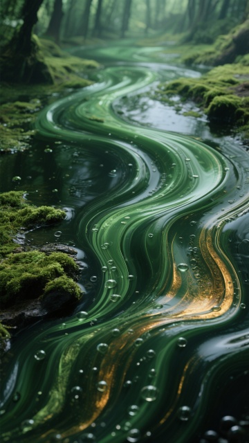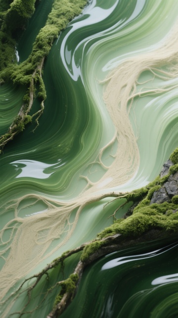 一幅以深绿、苔绿、橄榄绿为主色调的抽象流体艺术作品,融合森林苔藓的细腻纹理与深海藻类的有机形态,画面中呈现出流动的墨绿色波浪状纹路,其间点缀着象牙白与灰绿色的柔和漩涡,整体色调沉稳而富有自然生机,光线从上方柔和洒落,在粘稠的液态质感表面形成微妙的高光与深邃阴影,营造出静谧而神秘的自然流动氛围,纹理细节丰富,既有岩石表面的粗糙颗粒感,又有水波荡漾的顺滑过渡,色彩层次分明,从近至远呈现出由深至浅的绿色渐变,宛如一片被定格的墨绿色海洋,充满自然的韵律与生命力。