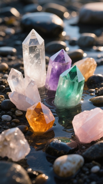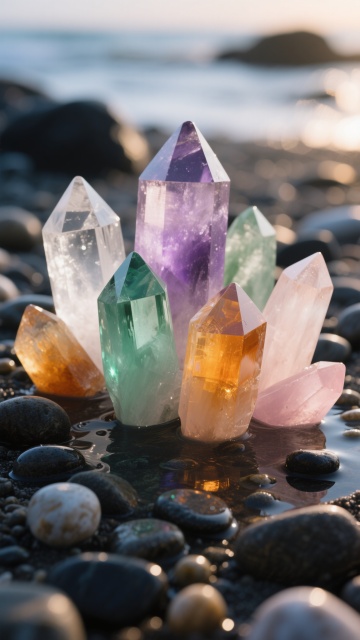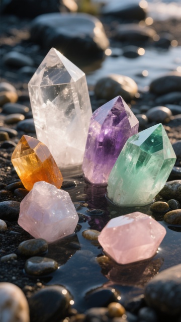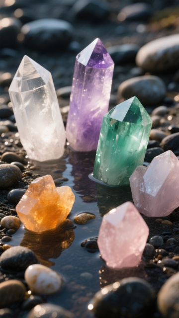 阳光下,造型各异的彩色水晶簇与原石散落在深蓝色天鹅绒布上,水晶棱角分明,折射出耀眼光芒,呈现出透明、紫色、绿色、橙色等多种色彩,表面光滑有光泽,背景为纯净的深蓝色,水晶底部有细微的阴影,整体画面色彩鲜明,光影效果突出,具有高清晰度和细腻质感。