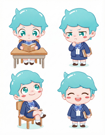 一套6个不同造型的卡通学生角色集合,每个角色保持相同的可爱Q版手绘风格,圆润线条,简洁色块,大而明亮的眼睛,腮红细节,纯色背景,规整网格排布;角色包括:坐着阅读思考的男孩、举着铅笔写字的女孩、戴着眼镜做实验的男孩、背着书包挥手的女孩、趴在桌上画画的男孩、抱着书本微笑的女孩,每个角色穿着不同颜色的校服,整体画面色彩变换为清新明快的蓝橙配色,保持元素内容和风格统一性。