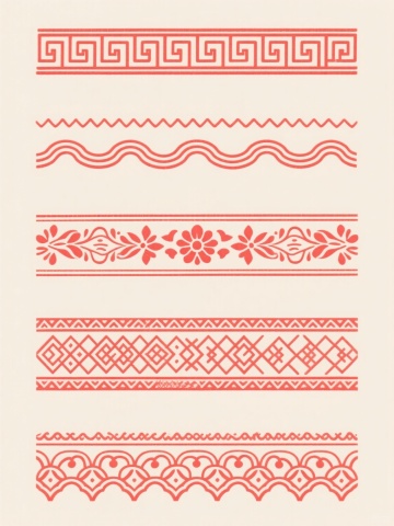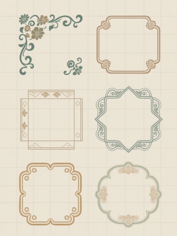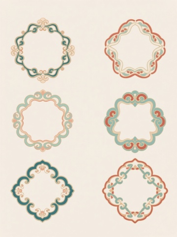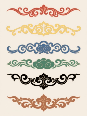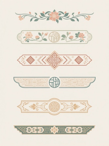 六个不同配色、完全不同样式的国风花边元素,以规律的垂直排列方式分布在纯白色的浅色背景上,每个花边均由传统中国风的花卉、卷草纹等图案构成,线条简洁流畅,图案精致对称,色彩鲜明且互不相同,整体呈现出典雅、古朴的东方美学韵味,适合作为装饰性纹样使用。