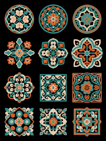 一套六个不同的传统花纹图案,每个图案都以对称的几何花卉为基础,采用简约的线条勾勒,以深蓝色为主色调,白色为背景,图案大小均匀,呈两行三列规整排布,整体风格古典雅致,具有浓厚的传统装饰艺术气息,单个图案独立完整,适合用于传统风格的装饰设计素材集合。