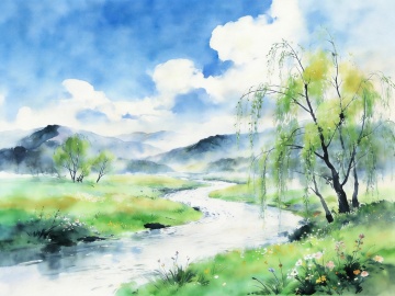 (用户需求:改变风格) 印象派风格,湖边风景,平静的蓝色湖面,远处有连绵的山脉和茂密的森林,近处绿色的草地,草地上有一个黑色的长椅和一个树桩,树枝从上方垂下,阳光透过树叶洒下斑驳的光影,整体色调明亮清新,笔触松散而富有动感,色彩丰富且具有视觉冲击力,营造出宁静而美好的氛围。