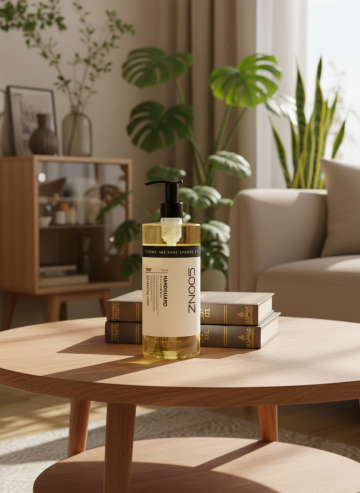 高清摄影风格的洗发水产品海报,柔和的米黄色背景营造出温馨自然的氛围,中央放置一瓶透明瓶身、黑色按压泵头的洗发水,瓶内是淡黄色液体,瓶身印有简洁的品牌文字,置于天然质感的浅棕色岩石上,岩石旁点缀一朵白色盛开的鲜花和几片绿色叶子,背景中两侧摆放着带有绿色植物的陶土花盆,光线从左上方柔和照射,形成细腻的阴影和高光,整体色调统一为温暖的米色、棕色和绿色,构图采用对称与平衡的布局,突出产品的自然纯净感,传达出沐浴在自然花香中的舒适体验。