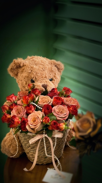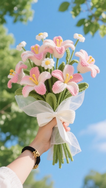 一束精心搭配的花束,主体由新鲜饱满的粉色玫瑰、橙色和白色洋牡丹、浅橙色非洲菊、淡蓝色小花及绿色尤加利叶等多种花卉自然组合,层次丰富,色彩和谐。花束用浅粉色褶皱包装纸包裹,底部系有米色网状丝带蝴蝶结,质感细腻。明亮柔和的光线从上方照射,在花束上形成自然的光影和阴影,背景为简约的白色墙面和浅色家具,整体呈现温馨柔和的暖色调,营造出清新、浪漫、优雅的氛围,具有高清晰度的写实质感。