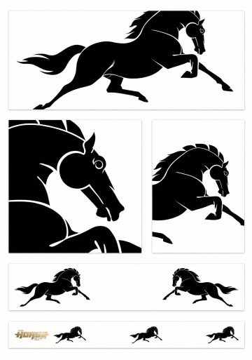 六个不同样式、不同材质、不同动作的马造型,均采用黑白剪影风格,线条流畅有力,具有强烈的动态感和肌肉轮廓表现力,浅色背景,上下两行对齐排列,每个马的姿态各异,有的扬蹄奔腾,有的昂首嘶鸣,有的静立凝望,有的低头饮水,有的疾驰如风,有的腾空而起,整体构图简洁大气,视觉冲击力强,符合剪影艺术的特点,突出马的力量与优雅。