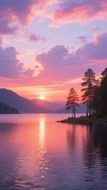 广角俯拍视角,晨曦微露时分,一片被晨雾轻轻笼罩的山谷湖泊全景。远处层叠的青灰色山脉峰顶覆盖着昨夜新降的皑皑白雪,山腰处云海如丝绸般缠绕流动。湖岸线蜿蜒曲折,一侧是橙红与金黄交织的茂密枫林,另一侧是深绿色的松树林,色彩对比鲜明而和谐。湖面如巨大的黑曜石镜面,精准倒映着渐变的天空——从东方鱼肚白过渡到淡粉、浅紫,再到远处的靛蓝。湖边长满沾着露珠的翠绿苔藓,几株红色浆果灌木点缀其间,几片枫叶轻轻漂浮在近岸水面。光线柔和而富有方向性,晨雾在阳光穿透下形成金色光柱,空气中悬浮着细小的水汽颗粒。构图遵循黄金分割,前景的岩石、中景的湖岸与远景的山脉形成完美的视觉引导线,景深从近岸的露珠到远山的积雪都保持清晰锐利,整体氛围既静谧神圣又充满苏醒的生命力。