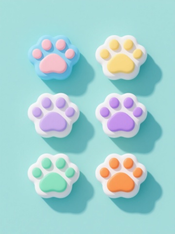 一套6个完全不同的宠物爪印图标系列,保持原有的简约现代风格和规整排布,每个爪印采用不同的纯色背景和对应的爪印色彩,包括蓝色背景配白色爪印、绿色背景配白色爪印、黄色背景配白色爪印、紫色背景配白色爪印、橙色背景配白色爪印、红色背景配白色爪印,每个爪印都具有相同的圆润形状、光滑质感和长阴影效果,整体呈现出清新可爱、统一协调的视觉效果,适合作为宠物相关产品的图标集合使用。