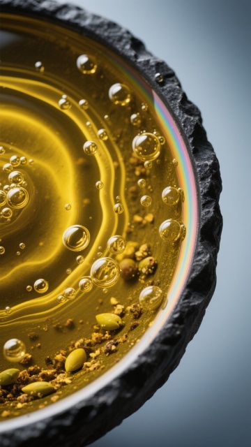 微距俯拍,金黄至琥珀色的特级初榨橄榄油在深色胡桃木容器中形成完美的曲面,表面张力使油面呈现出丝绸般细腻的波浪状纹理,数十个大小不一的晶莹气泡悬浮其中——有的如珍珠般单独静卧,有的则聚集成精致的泡沫星系,液体边缘泛着如同融化黄金般的高光。柔和的浅灰色渐变背景上,一束45度角的聚光从上方斜射而下,在油面形成星芒状反光点,气泡表面折射出彩虹般的微小光谱,底部则投下层次分明的柔和阴影。橄榄油特有的温润光泽与气泡的透明质感形成鲜明对比,整体画面呈现出液体黄金的纯净与生命力,每一滴油的流动轨迹都被清晰捕捉,细节极致入微。