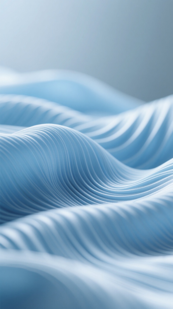 一张特写镜头下的高级感褶皱面料,面料表面呈现出细腻流畅的波浪形立体条纹纹理,具有丝绸般柔和的光泽感和垂坠飘逸的质感,整体色调为纯净的冰川蓝色,光线从左上方柔和洒下,在面料的褶皱处形成自然的明暗过渡,高光区域明亮而不刺眼,阴影部分柔和深邃,背景为模糊的浅灰蓝色渐变,营造出简约、优雅、静谧的氛围,面料的纹理细节清晰可见,展现出高品质的材质特性。