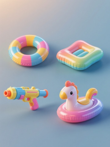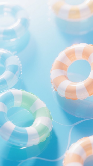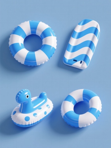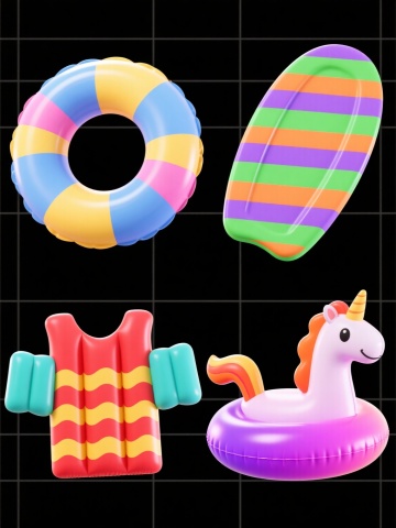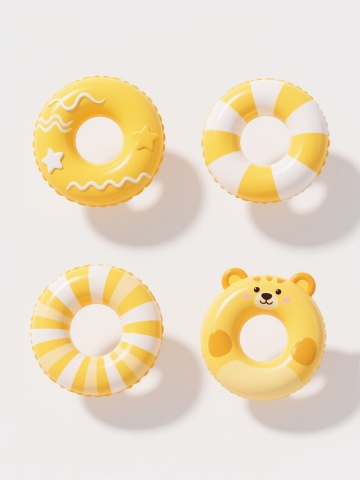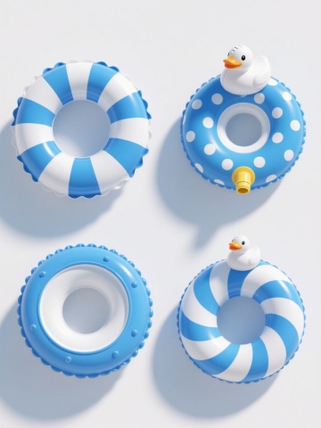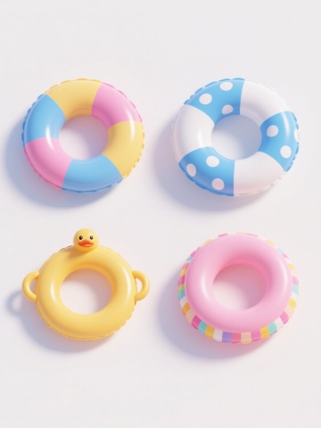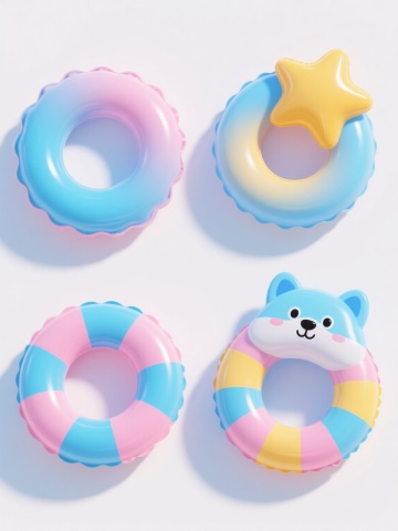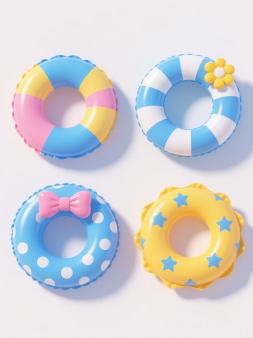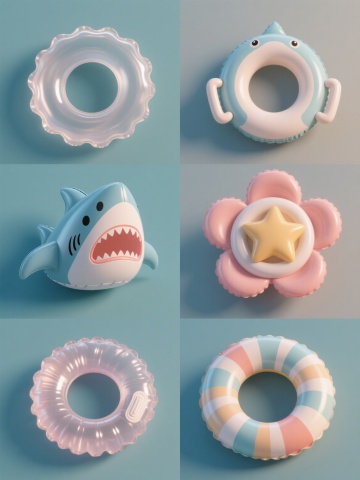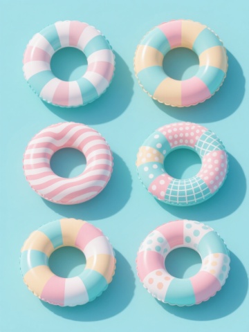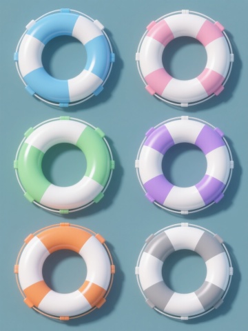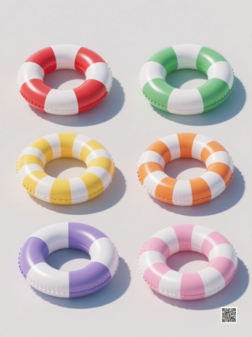 6个造型各异的充气游泳圈系列素材集合,每个游泳圈均保持3D立体质感、光滑PVC材质表面、清晰的充气褶皱细节和高光反光效果,整体采用纯色背景,色彩完全不同,第一个为红白宽条纹、第二个为黄蓝渐变、第三个为粉紫波点、第四个为绿橙撞色、第五个为黑银螺旋纹、第六个为彩虹渐变色,所有游泳圈规整排列成两行三列,构图平衡对称,视觉层次清晰,设计感强,适合作为夏季水上活动宣传素材。