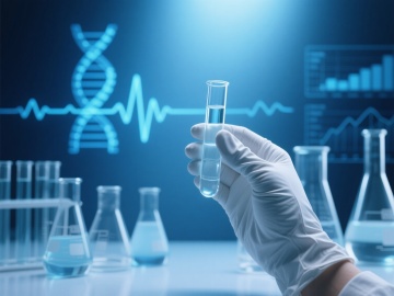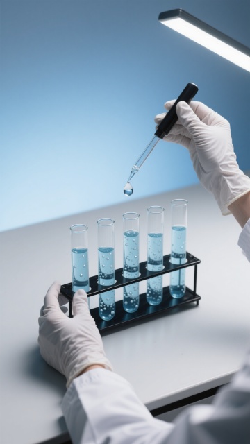 俯视角构图,极简主义实验室工作台面中央,一只戴着无菌白色丁腈手套的手正以毫米级精度操控着一支尖端极细的石英微量移液器,透明的液体弯月面在吸头末端形成完美的半球体,正悬停在一支刻有金色刻度线的硼硅酸盐玻璃试管正上方2毫米处,试管内装有三分之二体积的淡蓝色荧光溶液,底部沉淀着细密如星尘的白色颗粒,周围环绕着五只排列成正六边形的相同试管,每只试管内液体呈现出从浅蓝到靛蓝的渐变层次,背景是被柔和白光均匀照亮的浅灰色环氧树脂台面,左侧放置着一个带有蓝色LED指示灯的小型离心机,右侧是半开的磨砂玻璃试剂瓶,整个画面采用高对比度的蓝白灰三色系统,8K超高清分辨率捕捉到手套纹理和液体表面张力的微妙变化,浅景深使所有元素聚焦于移液动作的黄金分割点,营造出冷静、精准、近乎仪式感的科学美学。