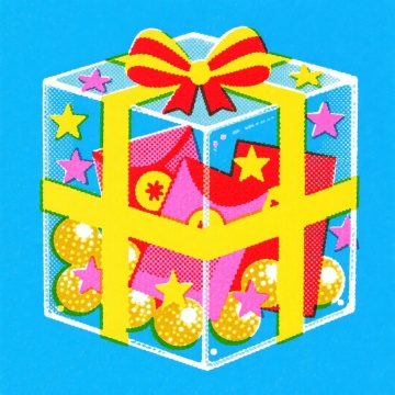 一个水彩风格的礼物盒插画,白色背景,盒子主体为橙黄色,表面有斜向的白色条纹装饰,顶部为红色盖子,系着一个深绿色的蝴蝶结,整体线条圆润,边缘有淡淡的阴影效果,呈现出可爱的卡通贴纸质感,礼物盒造型变换为打开状态,盒盖微微掀起,露出内部部分内容物的暗示。