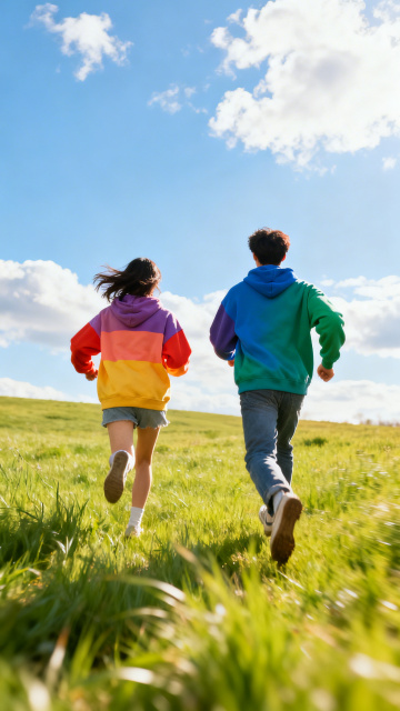 三位充满活力的年轻人在开阔的城市平台上向前奔跑,姿态轻盈舒展,充满动感与喜悦。画面采用明亮清新的摄影风格,主色调为湛蓝的天空、洁白的云朵与人物运动服的紫色、灰色、米色等活力色彩,光影明亮柔和,阳光从上方照射形成清晰自然的阴影,凸显出人物的立体轮廓和运动的动态感。背景可见远处模糊的城市天际线,地面是灰色带有白色线条的铺装,整体构图开阔舒展,充满积极向上的氛围。人物穿着现代运动服饰,包括运动夹克、短裤、运动鞋和帽子,展现出健康活力的运动风尚,画面传递出青春、运动、自由与快乐的情感。