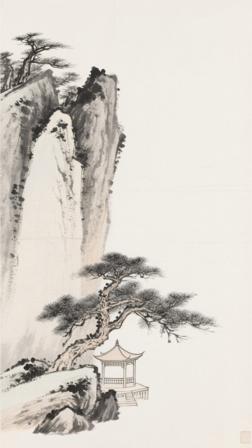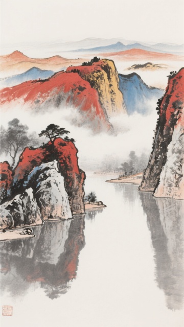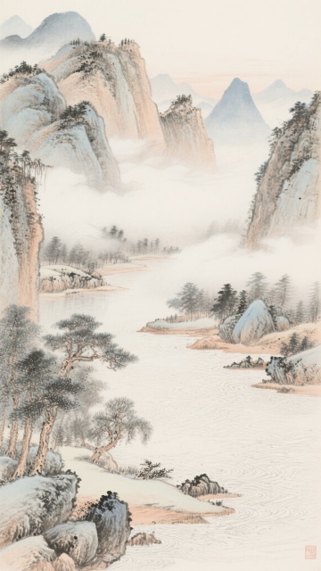水墨山水,古典中式风格,淡雅悠远,山石树木相映成趣。