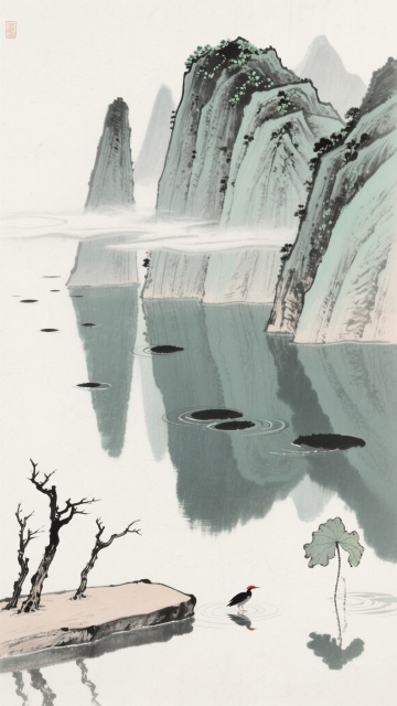俯瞰视角,中国传统水墨画风格,浅灰石绿调,极简留白构图。远景是如刀削般陡峭的层叠岩峰,以苍劲有力的线条勾勒轮廓,峰顶覆盖着稀疏的苔点,山间有几缕横向飘逸的淡墨云雾。中景为深潭,水面如镜,倒映着岩峰的局部轮廓,水面中央有几处不规则的墨点涟漪。近景左下角是一块斜卧的扁长岩石,岩石上生长着三株姿态扭曲的枯木,枝干如铁线般向右侧水面延伸。右侧水面上漂浮着一片残破的荷叶,叶上停着一只红顶墨羽的水鸟,正低头凝视水中倒影。整体画面营造出孤高寂寥、物我两忘的禅意,笔触枯涩与湿润交织,墨色浓淡对比强烈,留白处透出淡淡的宣纸纹理。