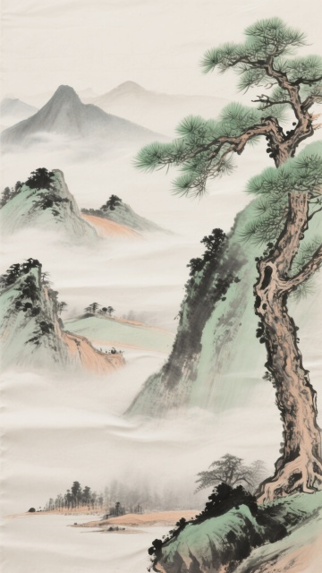 古典中式水墨风,山峦叠嶂,松柏苍劲,烟雾缭绕,印象画派手法展现自然之美。