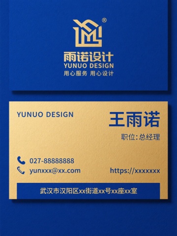一张商务风格的名片设计图,采用深蓝色与金色为主色调,整体风格简洁大气,具有强烈的商务感。名片正面上方为金色的"雨诺设计"标志,标志下方是金色的"YUNUO DESIGN"英文名称,再下方是"用心服务 用心设计"的金色小字。名片中间偏上位置是姓名"王雨诺",采用较大字号的深蓝色字体,姓名下方是职位"总经理",为较小字号的深蓝色字体。名片下方是联系方式,包括电话"027-88888888"、邮箱"yunxxx@xx.com"和网址"https://xxxxxxxxx",均为深蓝色小号字体。最下方是深蓝色的地址栏,内有金色的"武汉市汉阳区xx街道xx号xx座xx室"字样。名片背面为纯深蓝色背景,上方是金色的"雨诺设计"标志,标志下方是金色的"YUNUO DESIGN"英文名称,最下方是金色的"YUNUO DESIGN"英文名称,整体设计简洁、专业、商务感强。