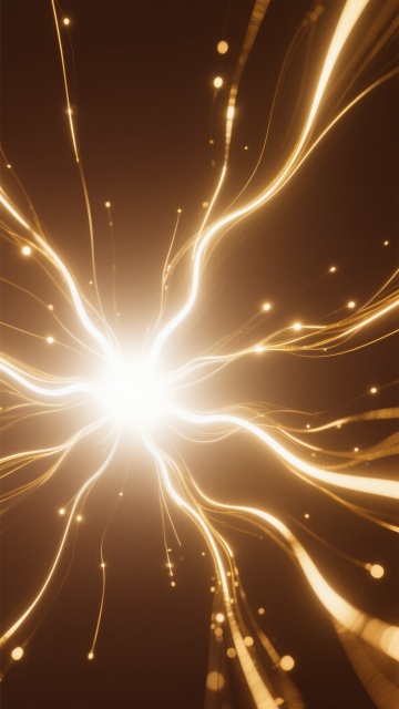 一张保持纯色背景的抽象光效海报,整体艺术风格为光效抽象,主色调为深棕色、金色和明亮的白色,光影运用呈现出强烈的光源中心效果,光线强度极高,中心区域有明显的高光表现,周围散布着细长的金色光丝和锐利的光斑,光效具有透明且带有锐利边缘的质感,整体构图呈现出从中心向四周发散的动态视觉引导线,氛围营造出神秘而又充满能量的感觉,画面中没有具体物体,核心视觉元素为抽象的光效形态,这些光效形态呈现出细长的线条状和点状,在纯色背景上以中心聚集、四周扩散的空间位置关系分布,光效之间仿佛在进行能量的互动,视觉层级上中心明亮区域为最重要的视觉焦点,通过极高的亮度和对比度被强调,信息传达效率高,能在短时间内让观者感受到强烈的光效冲击力和神秘感,设计感体现在光效形态的动态平衡与纯色背景的简洁对比上。