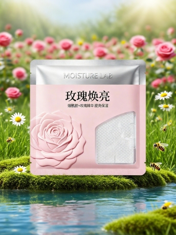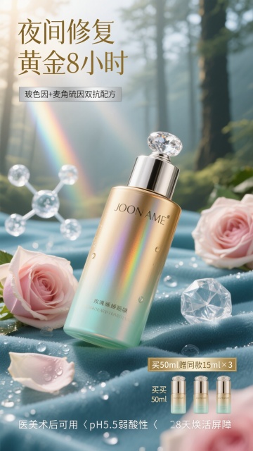 特写镜头,磨砂质感的圆柱形玻璃瓶中装着淡粉色的玫瑰精华液,搭配银色金属按压泵头和淡金色品牌标识"FLORA DEW",瓶身半透明设计能看见内部悬浮的玫瑰花瓣,放置在铺满白色鹅卵石的浅木托盘上,周围点缀着新鲜玫瑰花瓣、尤加利叶和白色满天星,背景为渐变的淡紫色到淡粉色,光线柔和如清晨的薄雾。海报上方有"玫瑰焕活 水润透亮 花漾精萃精华液"及"新品上市限时8折"的文字,右下角有两个水滴形标签分别标注"天然玫瑰萃取"和"24小时保湿",底部配有"植萃舒缓配方""提亮肤色 抚平细纹""敏感肌适用"的产品功效描述。