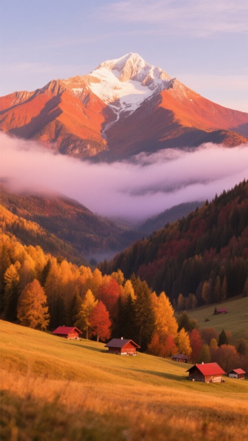 广角俯拍视角,晨曦微露时分,一片被晨雾轻轻笼罩的山谷湖泊全景。远处层叠的青灰色山脉峰顶覆盖着昨夜新降的皑皑白雪,山腰处云海如丝绸般缠绕流动。湖岸线蜿蜒曲折,一侧是橙红与金黄交织的茂密枫林,另一侧是深绿色的松树林,色彩对比鲜明而和谐。湖面如巨大的黑曜石镜面,精准倒映着渐变的天空——从东方鱼肚白过渡到淡粉、浅紫,再到远处的靛蓝。湖边长满沾着露珠的翠绿苔藓,几株红色浆果灌木点缀其间,几片枫叶轻轻漂浮在近岸水面。光线柔和而富有方向性,晨雾在阳光穿透下形成金色光柱,空气中悬浮着细小的水汽颗粒。构图遵循黄金分割,前景的岩石、中景的湖岸与远景的山脉形成完美的视觉引导线,景深从近岸的露珠到远山的积雪都保持清晰锐利,整体氛围既静谧神圣又充满苏醒的生命力。