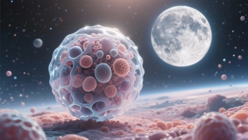 超写实3D渲染的细胞结构,半透明蓝色细胞膜包裹着内部复杂的细胞器,表面布满不规则的突起和颗粒状纹理,具有清晰的立体感和细腻的材质表现,光线从上方照射形成柔和的高光与阴影对比,整体呈现出科学微观摄影的精确感与生物医学可视化的专业质感,渲染效果通透且细节丰富,背景为纯白色以突出主体结构。