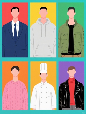 一组6个规整排布的插画风格素材集合,每个素材均为纯色背景,展示不同款式的男士上半身商务着装,保持元素类目为西装、衬衫、领带的组合。整体采用扁平化插画风格,线条简洁流畅,色彩平涂无渐变,边缘清晰锐利。每个素材变换不同的整体色彩方案:1. 深蓝色西装+白色衬衫+酒红色领带配浅灰色背景;2. 炭灰色西装+浅蓝色衬衫+深蓝色领带配米白色背景;3. 藏青色西装+浅粉色衬衫+深绿色领带配淡蓝色背景;4. 黑色西装+浅紫色衬衫+银色领带配浅棕色背景;5. 深棕色西装+白色衬衫+蓝色条纹领带配浅绿色背景;6. 深绿色西装+浅灰色衬衫+橙色领带配浅黄色背景。所有素材保持一致的构图角度(正面上半身)、相同的视觉比例和布局,形成风格统一、色彩多样的商务着装系列插画,无任何文字或标识元素。
