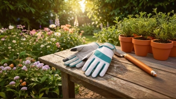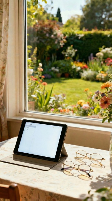 阳光明媚的花园露台餐厅,原木色方形餐桌搭配藤编靠背餐椅,桌面上摆放着白色陶瓷餐具和插满粉色玫瑰的玻璃花瓶,四周被茂密的绿植和盛开的花卉环绕,顶部悬挂着造型简约的白色布艺吊灯,地面铺设浅色防滑地砖,远处可见木质围栏和蓝天白云,整体呈现出清新自然、温馨舒适的田园风格,光线明亮柔和,营造出轻松愉悦的用餐氛围。