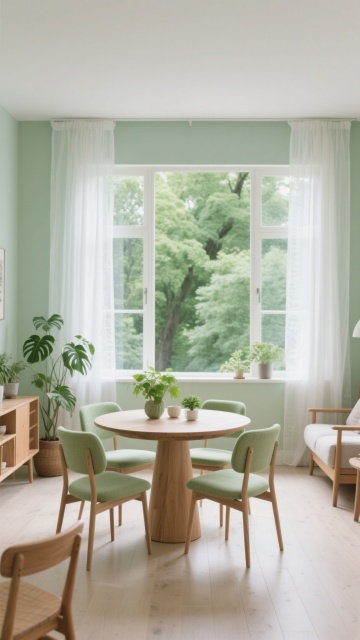 明亮通透的现代简约风格餐厅内部场景,以白色和浅木色为主色调,自然光透过大面积落地窗洒入室内,天花板悬挂着线条简洁的几何形白色吊灯,中央区域摆放着铺有浅色亚麻桌布的圆形餐桌,搭配浅灰色布艺餐椅,餐桌中央点缀着小型绿植花艺,靠墙设置悬浮式浅木色餐边柜,陈列着精致的玻璃器皿,角落处放置一个造型简约的藤编花瓶,插有几支白色和浅粉色的长茎鲜花,地面铺设浅色木地板,整体空间干净整洁、温馨舒适,充满自然清新的气息。