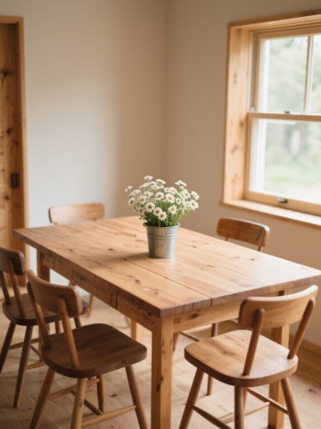 日式侘寂风餐厅内部场景,原木色餐桌椅整齐排列,墙面悬挂浮世绘风格装饰画,天花板垂下和纸灯笼散发柔和暖光,窗边绿植点缀生机,整体氛围宁静质朴,木质纹理清晰可见,光线柔和自然,营造出简约而富有禅意的用餐空间。