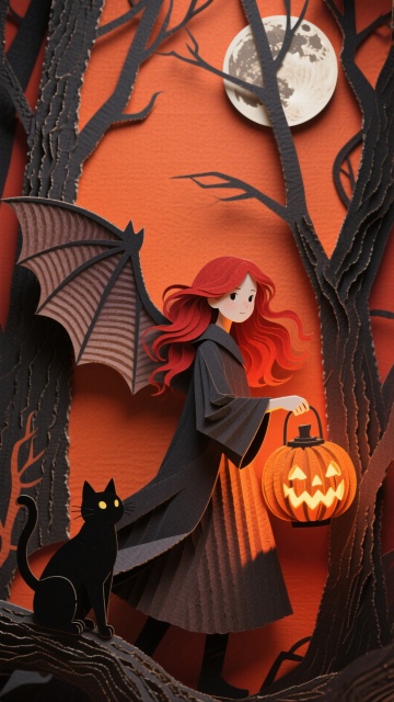 主体是带女巫帽的小阿飘趴在巨型南瓜灯上,周围环绕幽灵、蝙蝠、小南瓜灯等元素,背景是紫粉色渐变的月夜,点缀蝙蝠和枯树,神秘氛围。