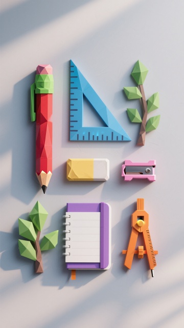 3D低多边形风格学习主题插画,白色背景,六个学习元素整齐排列成两行三列,柔和渐变色彩,元素包括红色削尖铅笔、蓝色翻开笔记本、黄色圆形量角器、绿色三角尺、橙色橡皮擦、紫色卷笔刀,每个物体边缘有轻微高光,整体呈现简洁明快的教育氛围,物体立体感强,阴影柔和自然,色彩鲜明且协调。