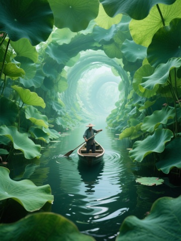 高清人像,专业人像摄影。虚实结合,画面氛围渲染。绿色主题,绿色长裙子,坐在荷花池中间的船头上,手持荷叶。85定焦镜头拍摄,影楼摄影效果。侧面人像