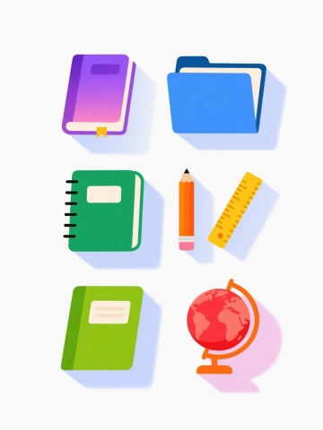 六个学习主题相关的3D图标,保持渐变透明质感、平滑光影过渡和清晰边缘的风格,元素分别为蓝色书本配放大镜、红色铅笔配笔记本、黄色灯泡配齿轮、绿色地球配书本、紫色钢笔配便签、橙色计算器配图表,每个图标独立排列整齐,白色背景,统一的半透明立体效果和柔和高光,简洁现代的学习工具视觉设计。
