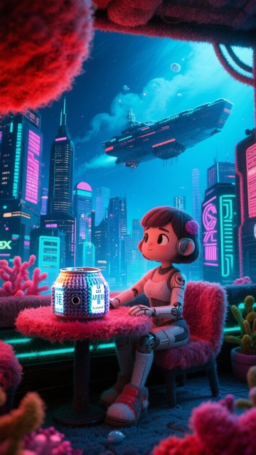 赛博朋克风与软3D结合,霓虹灯映照未来都市,卡通少女静坐毛绒座椅,机械臂轻触彩罐,梦幻感十足的虚拟现实场景。