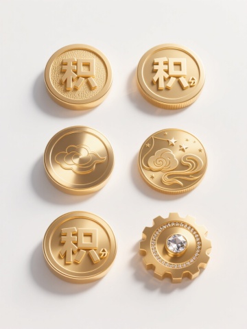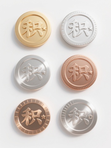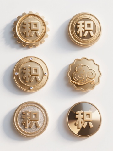3D渲染风格,六个不同样式、不同材质、不同元素的积分标志,整体呈圆形徽章形态,表面有“积”字浮雕。材质包含金属质感(金色、银色、铜色)、磨砂质感、光泽塑料质感,元素细节分别为:精细放射状纹理、齿轮纹路边缘、内嵌小星形图案、磨砂底+亮面文字、带有细小凸起点缀、边缘有波浪形装饰。所有积分标志在纯净白色背景上以整齐的两行三列矩阵式排列,每个徽章间距均匀,光线从左上方向右下方照射,形成柔和的阴影和高光,展现出清晰的立体感和材质差异,整体构图平衡对称,视觉层次分明。