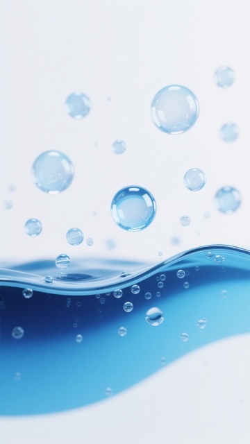 超写实主义风格,以清澈透明的水珠和气泡为核心视觉元素,画面中央是一个较大的透明气泡,内部含有复杂的、类似分子结构的透明水膜分隔,周围环绕着大小不一、悬浮的水珠和气泡,水珠表面光滑,折射出柔和的光线,带有细腻的高光和自然的阴影。整体色调以纯净的浅蓝色和白色为主,背景为渐变的浅蓝色,简洁干净,没有多余元素,营造出轻盈、通透、湿润、纯净的氛围。光线从上方柔和洒下,赋予水珠半透明的质感和微妙的光晕效果,气泡边缘有清晰的轮廓光,画面中点缀着细小的水珠飞溅效果,增强动感与层次感,整体构图突出水珠的晶莹剔透和空间悬浮感,保持精华主题,背景简单不抢主体。