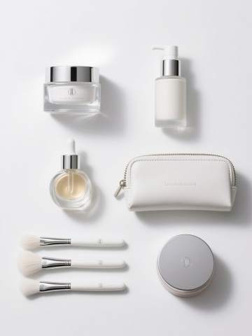 极简高端美妆产品展示海报,六个完全不同的美妆元素规整排布于纯白色纯色背景上,保持原图像的高清写实摄影风格,主色调为纯净白色与产品本身色彩,柔和均匀的顶光照明,清晰展现各产品的透明玻璃与金属材质质感,高光与阴影细节丰富。从左至右、从上至下依次为:方形透明玻璃面霜瓶配银色金属盖,瓶身简洁无繁复装饰;圆柱形磨砂玻璃乳液瓶带按压泵头,呈现细腻哑光质感;长方形皮革化妆包,带有精致金属拉链和简约品牌标识压纹;三支不同尺寸的化妆刷,白色刷毛搭配银色金属刷柄,刷柄末端有品牌logo;椭圆形透明精华液瓶,内装淡金色液体,瓶口为滴管设计;圆形罐装散粉,银色金属罐身配同色系盖子,表面有细腻的品牌刻字。整体构图采用对称均衡的网格布局,各元素间距一致,营造出高端、简洁、有序的视觉层级,信息传达直接高效,符合奢侈品美妆的目标受众审美,设计感十足,无任何文字、LOGO、电话地址及二维码。