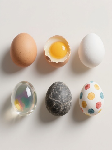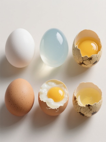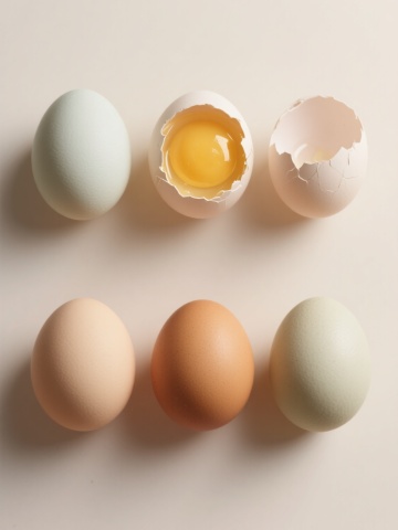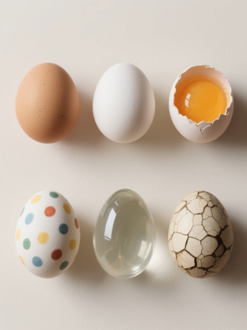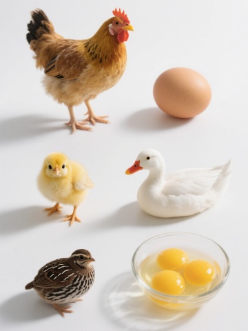 一系列6个规整排布的家禽及相关元素的超写实摄影图像,保持与原图一致的高细节、真实光影和质感,背景为纯白色。元素包括:1. 站立的棕色母鸡,羽毛呈暖黄色调,尾部羽毛蓬松,喙部橙黄,眼神温和;2. 浅褐色椭圆形鸡蛋,表面带有细微斑点纹理,置于浅色平面上;3. 黄色雏鸡,绒毛蓬松柔软,睁着圆溜溜的黑眼睛,翅膀微张;4. 白色鸭子,脖颈修长,喙部橙红色,羽毛洁白顺滑,身体呈流线型;5. 深棕色鹌鹑,体型小巧,羽毛带有黑白相间的条纹图案,头部圆润;6. 半透明的玻璃碗中盛放着三个鲜黄色的蛋黄,蛋白清澈,碗边缘光滑。所有元素均采用相同的写实摄影风格,光线从左上方照射,形成自然的阴影和高光,整体构图对称均衡,每个元素独立清晰,共同组成一个协调统一的家禽主题系列素材集合。