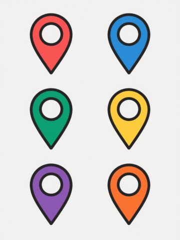 一组四个相同造型的地图定位标记图标系列,每个图标具有完全不同的材质表现,规整地排列在纯色背景上。图标主体为上半部分的红色水滴状标记和下半部分的蓝色圆形底座的组合形态。第一个图标呈现光滑的塑料材质,表面有细腻的高光,色彩为明亮的柠檬黄标记配天蓝色底座;第二个图标为磨砂金属质感,带有细微的纹理和柔和的反光,色彩为深灰色标记配银色底座;第三个图标是半透明的玻璃材质,边缘有光晕效果,色彩为淡紫色标记配浅青色底座;第四个图标为哑光陶瓷质感,表面温润无明显反光,色彩为橙红色标记配橄榄绿底座。所有图标保持一致的简约扁平风格,造型结构完全相同,仅在材质和整体色彩上做变换,整体布局整齐有序,背景为纯白色。