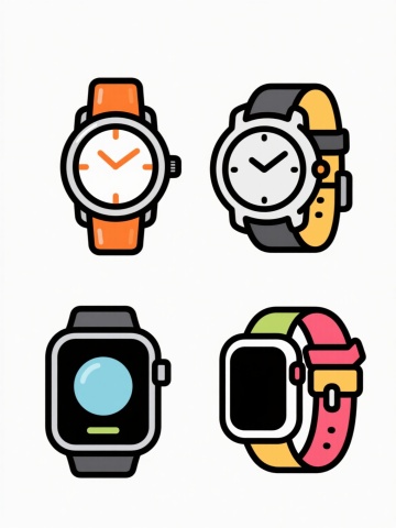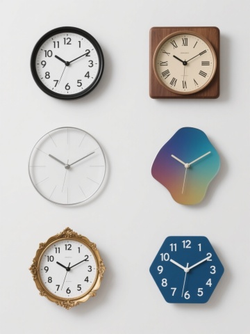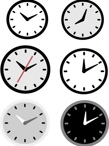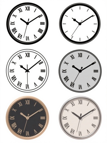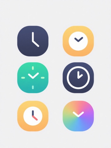 六个不同风格的钟表图标系列,每个图标均保持相同的基础钟表造型(圆形表盘、黑色时针分针、蓝色中心圆点、表盘上的短竖线和短斜线时标),但采用完全不同的艺术风格和色彩方案,每个钟表位于纯色背景中央,整体以规整的网格状排布。第一个钟表:极简主义风格,白色表盘配深蓝色边框和指针,背景为纯净的浅蓝色;第二个钟表:复古手绘风格,米黄色表盘配深棕色边框和指针,时标为手绘线条感,背景为暖米色;第三个钟表:赛博朋克风格,黑色表盘配霓虹蓝边框和亮紫色指针,时标带故障艺术效果,背景为深灰色;第四个钟表:扁平化孟菲斯风格,亮粉色表盘配黄色边框和绿色指针,时标为几何形状,背景为浅蓝色;第五个钟表:水彩质感风格,浅橙色表盘配红色渐变边框和褐色指针,整体带水彩晕染效果,背景为淡黄色;第六个钟表:像素艺术风格,深绿色像素表盘配浅绿色像素边框和白色像素指针,时标为像素块,背景为深青色。所有图标风格统一且差异化明显,构图规整,视觉上形成协调的系列感。