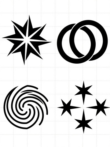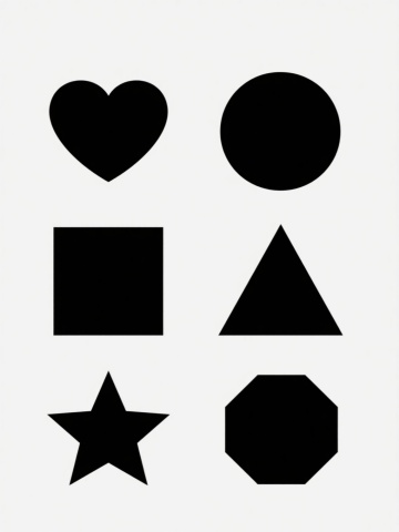 极简风格设计,纯白色背景上,六个完全不同的基础图形造型呈上下两行整齐对齐排列,每个图形均为纯黑色填充、边缘平滑的矢量风格,包括爱心、圆形、正方形、三角形、五角星和六边形,图形大小统一,间距均匀,整体构图简洁平衡,无任何文字或额外装饰元素。