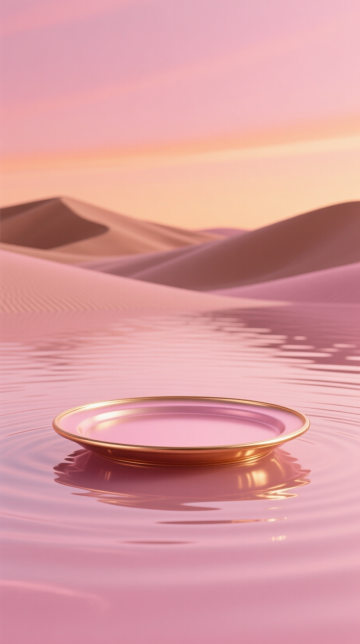 极简主义展台设计,画面中央放置一个圆形展台,展台底部为深色,台面光滑反光,周围是波浪状起伏的深色背景,上方是渐变的粉紫色天空,从底部的深紫逐渐过渡到顶部的淡粉,营造出宁静而神秘的氛围,光线柔和,整体色调以粉紫色为主,展台保持中立状态,无任何LOGO、文字及装饰元素。