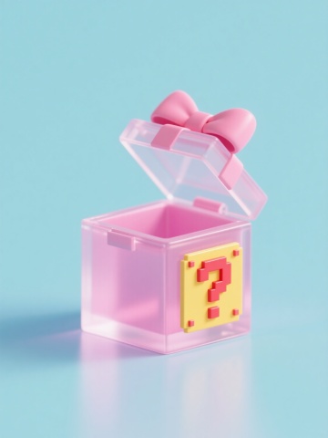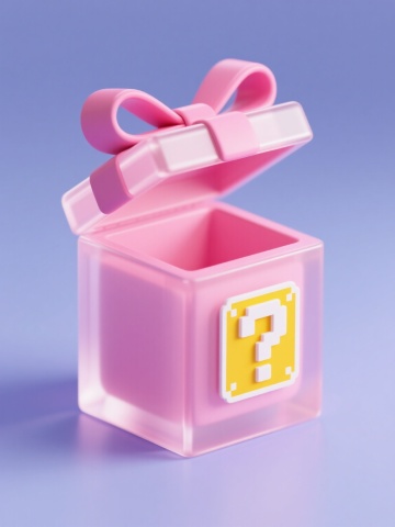 3D渲染风格的盲盒元素图案,简约现代造型,规整排布的单一盲盒,纯色背景,无任何文字,无logo,无水印,整体呈现出平滑的材质质感,柔和的光影效果,高光与阴影过渡自然,盒身呈方形结构,搭配立体的粉色蝴蝶结装饰,正面有像素风格的黄色问号图标,透明盒身设计,展现出轻盈通透的视觉感受,保持系列素材的统一性与设计感。