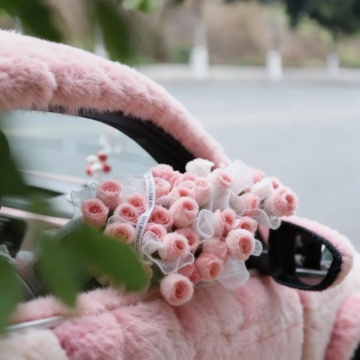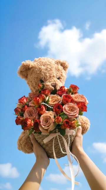 一束手工钩织的花束,主体是多朵粉色渐变的百合花,花瓣边缘颜色稍深,花蕊为黄色,搭配几朵白色的小雏菊,花茎为绿色,用白色雪梨纸和透明纱纸包裹,底部系着白色丝带蝴蝶结,一只戴着黑色和金色手链的手握着花束底部,背景是阳光明媚下的绿色树叶和湛蓝天空,整体呈现出清新自然、温馨治愈的氛围,色彩明亮柔和,光影清晰,具有手工艺术品的细腻质感和真实生活场景的生动感。