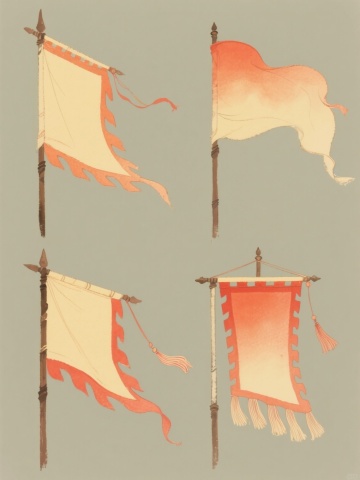 3D渲染风格的道旗设计展示图,浅色背景,上下两行对齐排列共六个道旗造型,每个道旗拥有独特的配色方案、样式设计和材质表现。道旗主体为垂直长方形旗帜,搭配金属质感黑色旗杆和圆形底座,旗杆顶部有小圆球装饰。第一行从左到右分别为:深蓝色哑光布料道旗,旗帜边缘有白色细条纹装饰;橙红色高光缎面道旗,旗帜中央有简约几何图案;浅绿色磨砂塑料质感道旗,四角有圆角处理。第二行从左到右分别为:淡紫色透明亚克力材质道旗,带有细微磨砂纹理;米黄色亚麻布道旗,表面有自然布纹肌理;浅灰色反光金属质感道旗,边缘有抛光处理。整体设计简洁现代,光影柔和,物体边缘清晰,具有产品展示图的专业感和真实质感,无任何文字、LOGO、二维码及电话地址等元素。